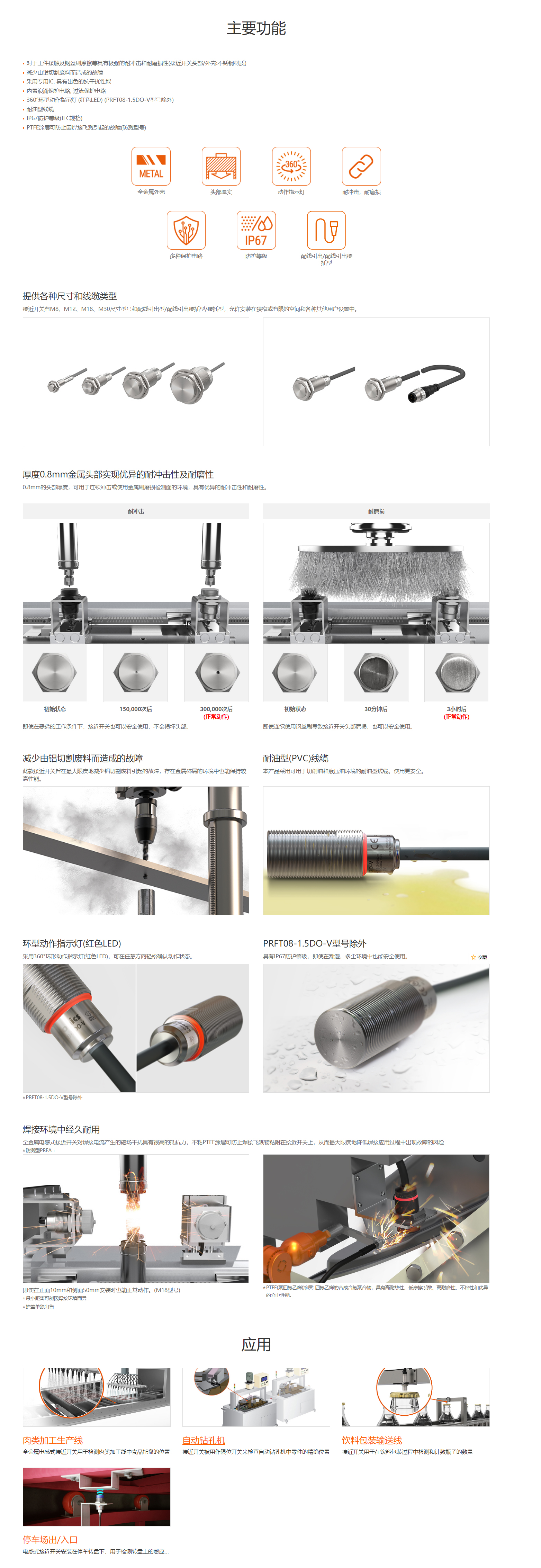 PRF系列圆柱形接近开关采用全金属外壳和不锈钢303制成的传感器头部。 坚固的开关外壳具有很强的抗变形和抗腐蚀能力,可应用于包括食品和饮料制造、化学和金属加工行业在内的各种环境。 0.8mm厚度的金属检测头提供高抗冲击性和耐磨性,360°环形动作指示灯让用户可以从各个角度快速识别动作状态。
