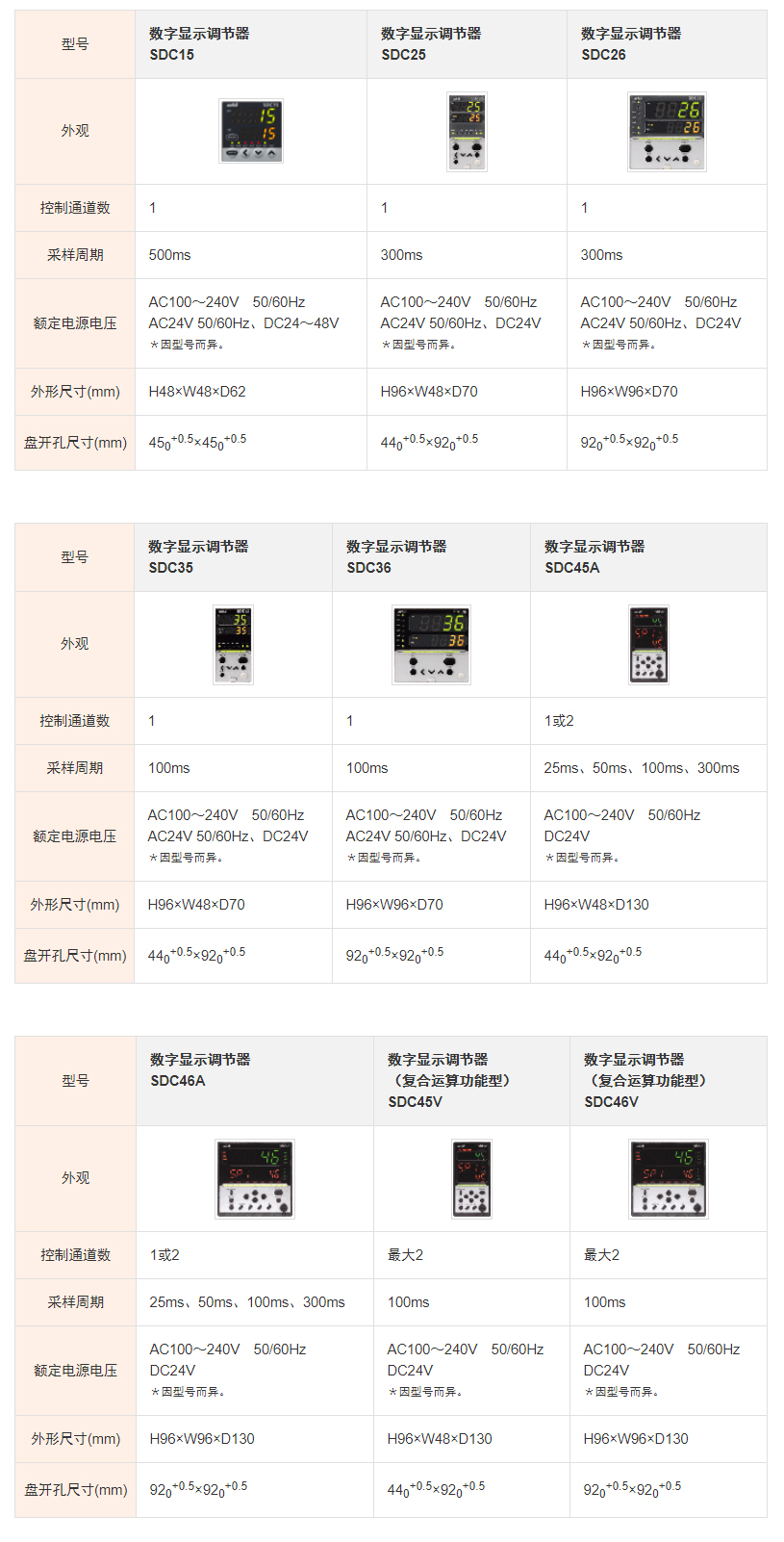 控制输出可为 SDC15/25/26/35/36=最大2点、SDC45=最大5点、SDC46=最大7点(根据型号)、分别可选择继电器接点、电压脉冲、连续电压、电流。